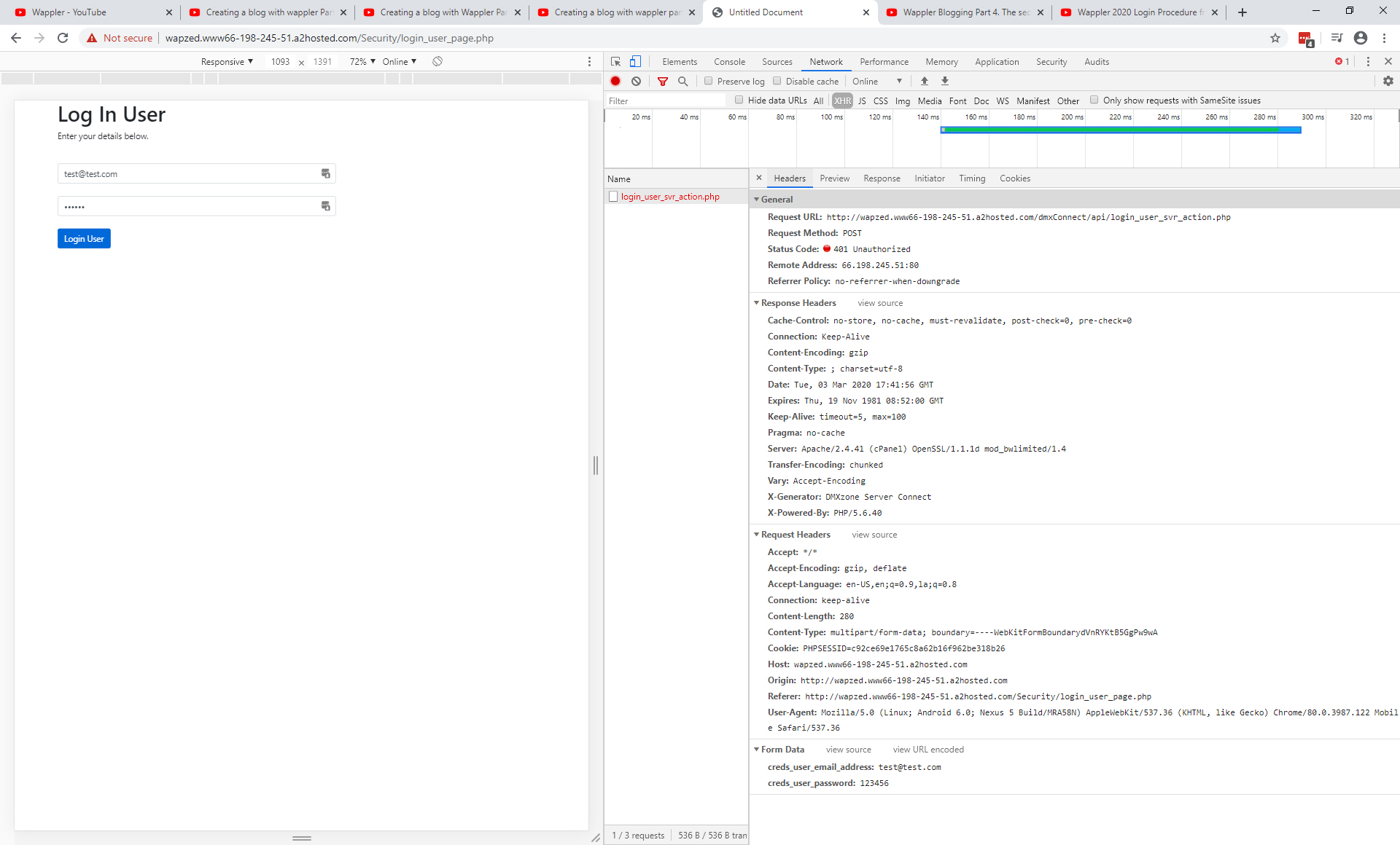 We have followed the login user docs multiple times here: [https://docs.wappler.io/t/login-create-a-working-user-login-page/2855] along with excellent expert videos from Brian https://www.youtube.com/watch?v=QnvVagY3LGM and Paul https://www.youtube.com/watch?v=QEoYxYtDKi0. We can sign up/create new users and have the credentials successfully displayed in the database as you can see in the screen shots. After many attempts we cannot login new users. Latest attempt throwing a 401 unauthorized error as shown in the screen shots. I would be grateful to the community if you could provide guidance on how I can rectify this to successfully login new users. Thank You in advance for your assistance.